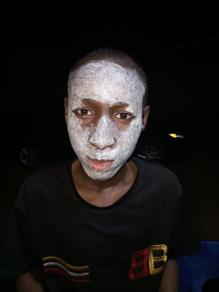 A person with white face paint fills the frame