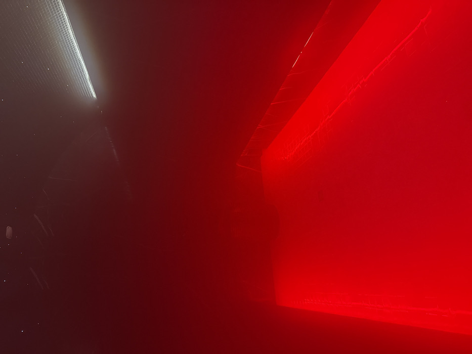 A high-contrast image features a room or space split between starkly different lighting schemes. The left side is bathed in cool, white light revealing a grid-like texture. The right side is dominated by intense red light, illuminating a flat surface and an angular architectural detail overhead. The central area has an ominous gradient between both hues, possibly indicating the transition point in the image.