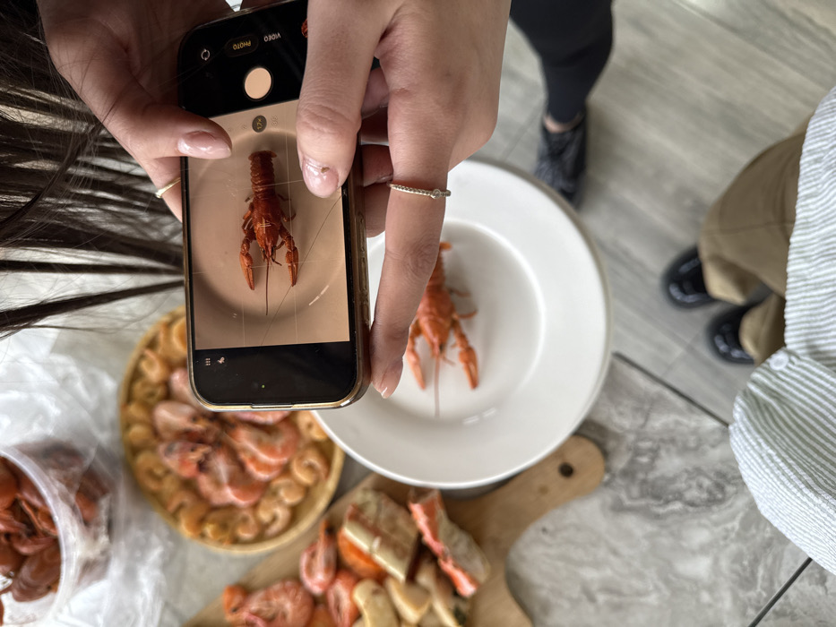 An overhead view captures an indoor scene in Voskevaz, Armenia, centered on a culinary display and an individual photographing it. Two human hands, with manicured light-colored nails and a thin ring on the right ring finger, hold a gold-colored smartphone horizontally. The smartphone screen displays a live camera preview of a single cooked, reddish-orange crawfish positioned on a white ceramic plate. The camera interface shows "1x" zoom and "Photo" mode. Below this plate, several other white ceramic plates are stacked. In the blurred background, to the left, a transparent plastic container is filled with numerous cooked crawfish. Adjacent to it, a round wooden platter holds a circular arrangement of cooked shrimp or smaller crawfish. A wooden cutting board displays various seafood items including cooked shrimp/crawfish and pieces of white and red imitation crab meat. The table surface beneath these items is light-colored, possibly gray or marble-patterned. Below the table, the lower half of a person's body is visible, wearing a light green and white striped garment, light brown trousers, and black shoes, providing the primary photographic perspective. To the right, another person's dark pants and dark shoes/slippers are partially visible on a light grey floor.