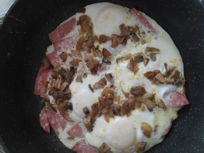 A close-up, top-down view depicts food cooking in a dark-colored, speckled frying pan, located in the city of Hlybokaye, Belarus. The pan contains four discernible fried eggs with set white and partially cooked yolks. Sliced, reddish-pink processed meat, consistent with salami or a similar sausage, is arranged around the periphery and interspersed within the cooked egg whites. Diced, browned mushrooms are scattered uniformly over the entire surface of the eggs and meat. The food appears to be in a cooked or actively cooking state. No people or interactions are visible in the scene.