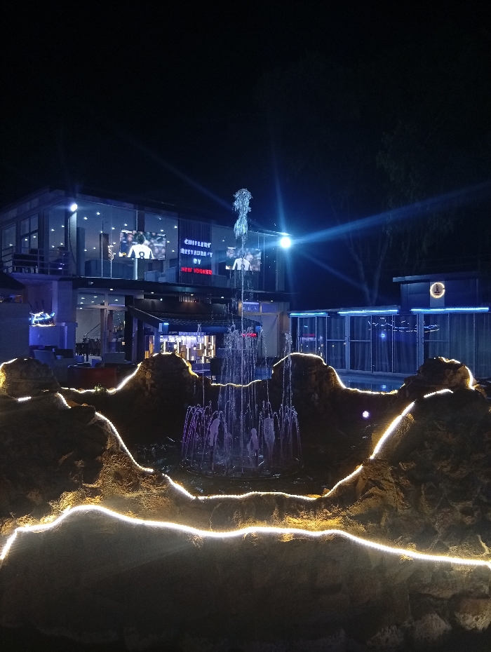 A nighttime shot features a fountain with illuminated cascades of water. The fountain is surrounded by rocks edged with bright white lights. Behind the fountain, a modern, glass-walled building, “Chillers Restaurant By New Yorker,” displays large screens with images. The scene is bathed in a mixture of blue and white light, emphasizing the water features and architectural details against the dark sky.
