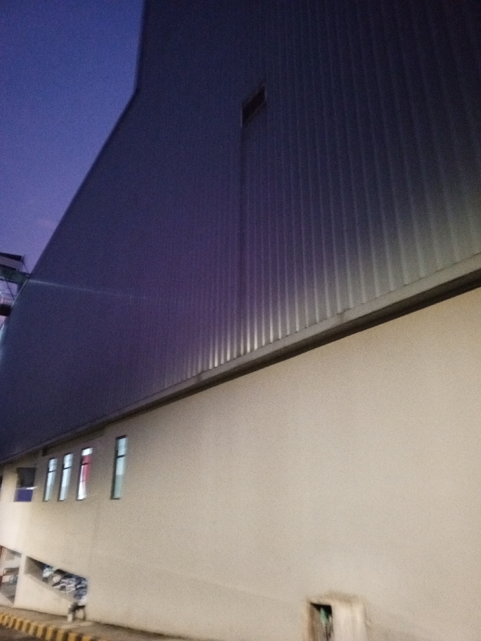 A tall industrial building with a corrugated metal exterior is partially visible against a twilight sky