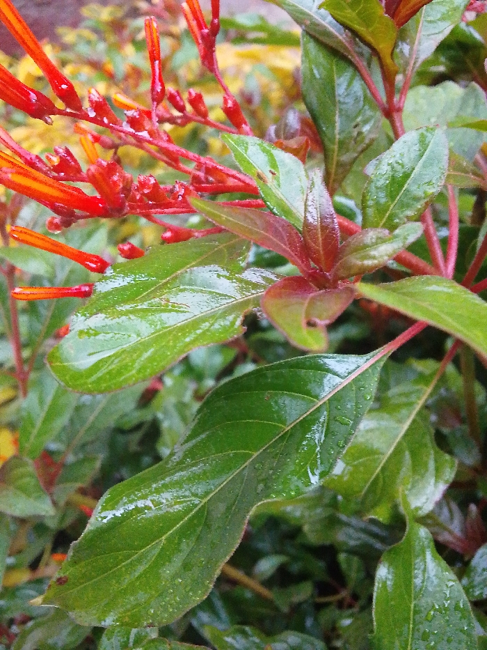 The scene, located outdoors in Ndeiya, Kenya, presents a close-up view of a plant. The primary subjects are numerous dark green, glossy leaves and clusters of slender, tubular red-orange flowers or developing buds. Multiple water droplets adhere to the surfaces of the leaves and flowers, consistent with recent rainfall or heavy dew. Some younger leaves display reddish hues. The background is out of focus, revealing additional green and yellowish vegetation. No people, animals, or man-made objects are visible.