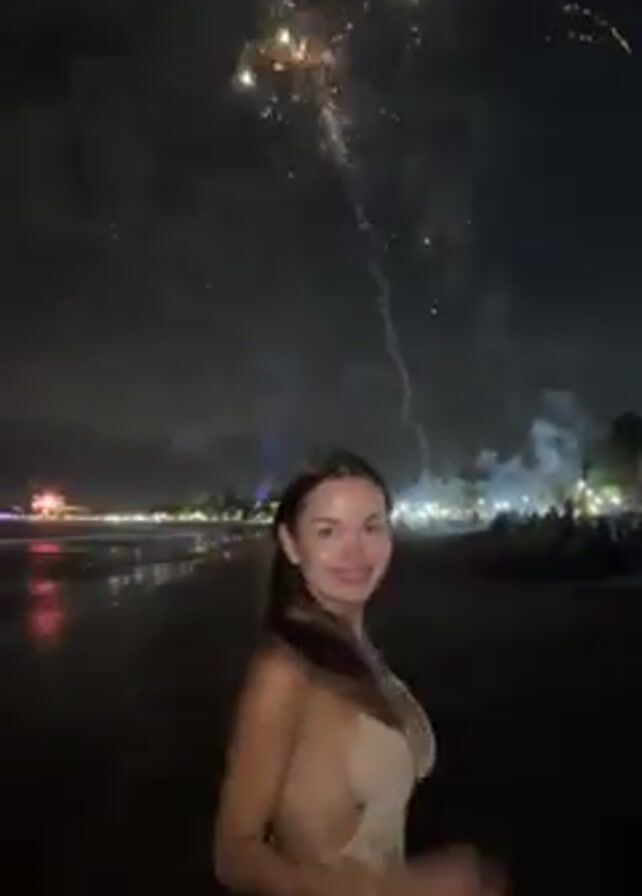 A woman in a light-colored, crocheted dress stands on a beach at night watching fireworks. The camera focuses on her as she turns around and smiles, then looks back up at the fireworks. The fireworks are varied in color, including gold, red, and white. The beach is dark with lights visible in the distance along the shoreline. The woman wears a small shoulder bag. She lifts her arm to adjust her hair, looking upwards at the display in the sky.
