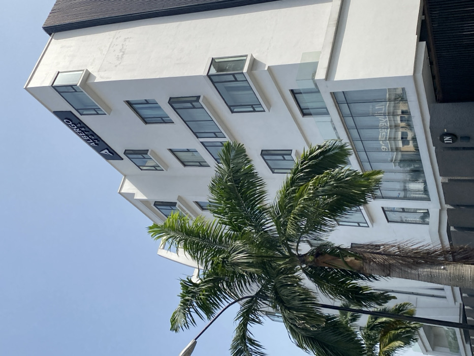 An exterior, low-angle photograph depicts the multi-story Albergo Hotel building, situated in the city of Moba, Nigeria, beneath a clear blue sky. The hotel's facade is predominantly white with a modern architectural design, featuring various styles of windows, some recessed and others forming bay windows, all with dark frames. A prominent, dark-lettered "ALBERGO HOTEL" sign is affixed to the upper portion of the building. In the foreground, a large palm tree with vibrant green fronds partially obscures the left side of the structure. A black street lamp post with a curved arm and light fixture is visible to the left of the palm tree. The ground level of the hotel incorporates large reflective glass windows, exhibiting reflections of an unseen adjacent building, and dark-colored wall paneling. A circular sign displaying "IN" is visible near the entrance area at ground level. No individuals or specific actions are depicted.