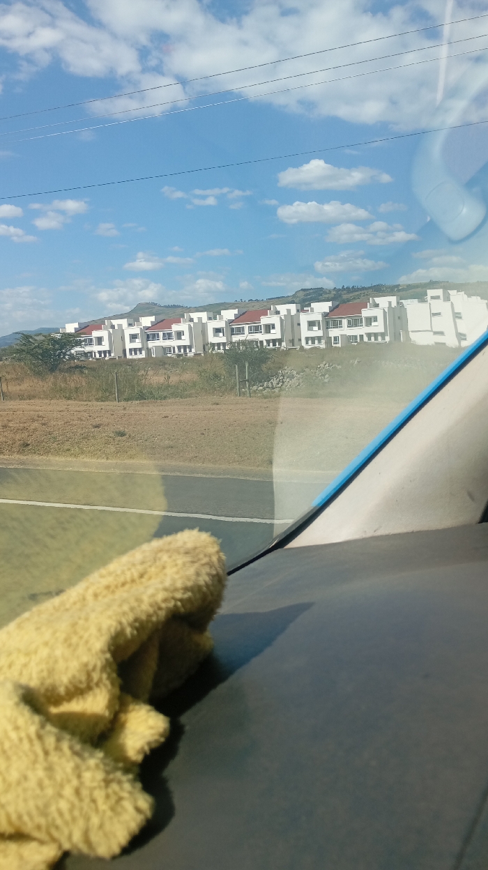 A row of white buildings with red roofs lines the horizon under a blue sky dotted with clouds. They sit atop a slight rise. A road stretches in front of the buildings, with a grassy field between the road and the buildings. The scene is viewed through a car windshield, with a yellow cloth resting on the dashboard. The car's interior is visible, including a portion of the dashboard and the blue trim of the windshield.