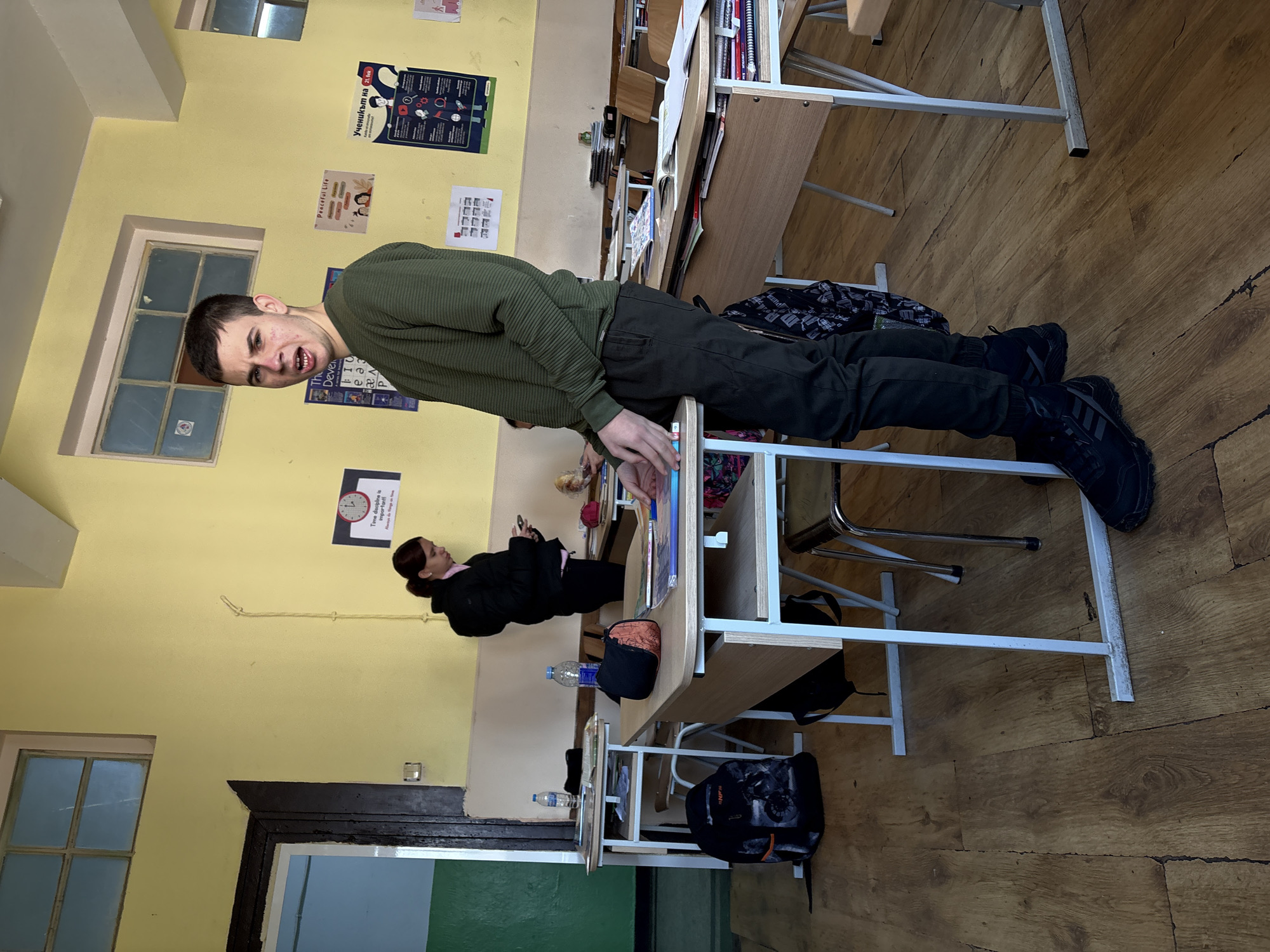 The image depicts a classroom interior located in Cherven Bryag, Bulgaria. The room features pale yellow walls, a light brown wooden laminate floor, and multiple high-set windows with light-colored frames and opaque glass. An open doorway on the left reveals a secondary space with a green lower wall. Educational posters, some in Bulgarian, are affixed to the yellow walls, including one with a clock titled "Time discipline is important" and others related to "Peaceful Life" and student information. In the foreground, a young male with short dark hair, wearing an olive green ribbed long-sleeved shirt, dark cargo pants, and black athletic shoes, stands facing slightly left. His mouth is open, revealing teeth, and his hands are resting on an empty section of a light wood and white metal student desk. A black backpack with orange accents rests on the floor behind him. In the background, to the left, a female with dark hair pulled back, wearing a black puffer jacket over a pink shirt and dark pants, stands near another student desk. She is looking down at a smartphone held in both hands. Multiple student desks with light wood tops and white metal frames are arranged in rows throughout the room, some with metal chairs tucked beneath them. Desks display various items including books, notebooks, papers, a black and orange pencil case, and plastic water bottles. A dark backpack hangs from a desk in the mid-ground. No direct interaction is visible between the two individuals.