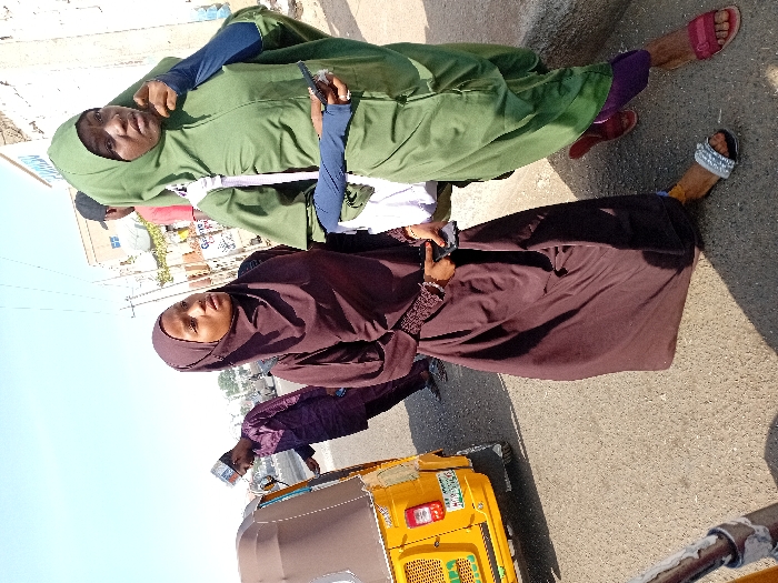 The image captures an urban street scene in Sani Mai Nagge, Nigeria, under clear, sunny daytime conditions. In the foreground, two young females stand on an asphalt road surface. The female on the left wears a dark brown full-length dress (abaya) and a matching hijab, accessorized with a dark shoulder bag. She holds a dark mobile phone near her waist and wears a silver-studded sandal on her right foot. The female on the right wears a green hijab and a loose-fitting green garment over purple trousers, with a white strap bag over her shoulder. She holds a dark mobile phone in her left hand and touches her chin with her right hand, wearing a red sandal on her left foot. In the midground, on the left, a yellow motorized tricycle (Keke Napep) is partially visible, displaying a Nigerian license plate, MNA-193YX. A male wearing a dark purple traditional tunic (kaftan) and a patterned cap (kufi) stands partially obscured next to the tricycle. Further in the background on the right, another male is partially visible, wearing a black cap and a red shirt. The background features various buildings, overhead power lines, and a street sign with partially visible text, including "GURARA". Shadows are cast on the asphalt surface, consistent with bright sunlight.