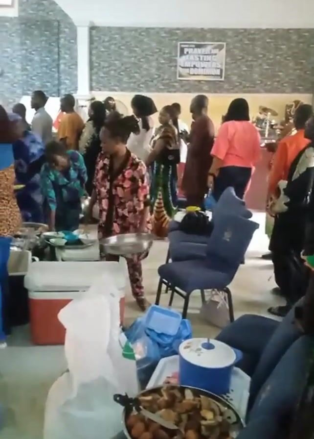 gathering of people in a large indoor space, possibly a church hall or community center. Several individuals are seen getting food from serving tables, indicating a meal or reception is taking place. There are platters of food, containers, and bags near chairs in the foreground, suggesting that people are serving themselves or preparing to eat. The crowd is diverse, with people wearing various styles of clothing. Some individuals are moving around, while others are standing in line for food. The environment seems lively, with conversations and movement throughout the space.