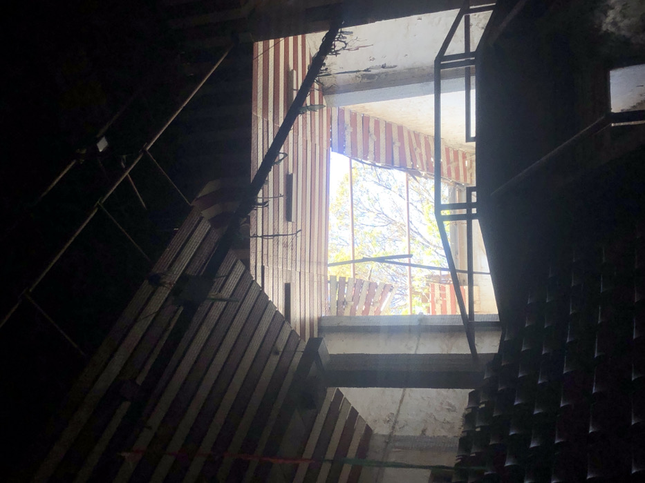 The scene depicts the interior of a large, dilapidated structure, likely an auditorium or hall, located in Yakubu, Nigeria. The dominant feature is a massive, arched opening in the roof and upper wall, through which bright daylight illuminates tree foliage and the sky outside. **Environment:** The interior is dimly lit, contrasting sharply with the bright exterior light. The building exhibits significant structural damage and disrepair. **Objects and Structures:** * **Roof/Ceiling:** The ceiling is partially collapsed or heavily damaged, with numerous horizontal panels, possibly wood or corrugated material, hanging loosely or missing. Exposed wooden beams and what appear to be metal pipes or conduits are visible in the dark upper reaches. Strips of material, possibly red and white insulation or decorative lining, are visible around the large opening and on some hanging panels. * **Walls:** Light-colored, possibly concrete or plastered, walls with visible weathering or damage are partially visible through openings and behind interior structures. Two large, dark vertical pillars are prominent on the left side, supporting the overhead structure. * **Seating Area:** In the lower left and center, multiple rows of empty, dark-colored auditorium-style seats are visible, receding into shadow. These seats are uniform in appearance and arrangement. * **Balcony/Tier:** A dark, metallic railing forms a barrier in the mid-ground, suggesting an elevated platform, balcony, or upper seating tier overlooking the lower seats. An angled, dark structure forms the front edge of this potential tier. * **Debris:** Loose strips of material and fragments of panels hang from the damaged ceiling and around the openings. **People/Actions/Interactions:** No individuals are present in the scene. No specific actions or interactions are depicted.