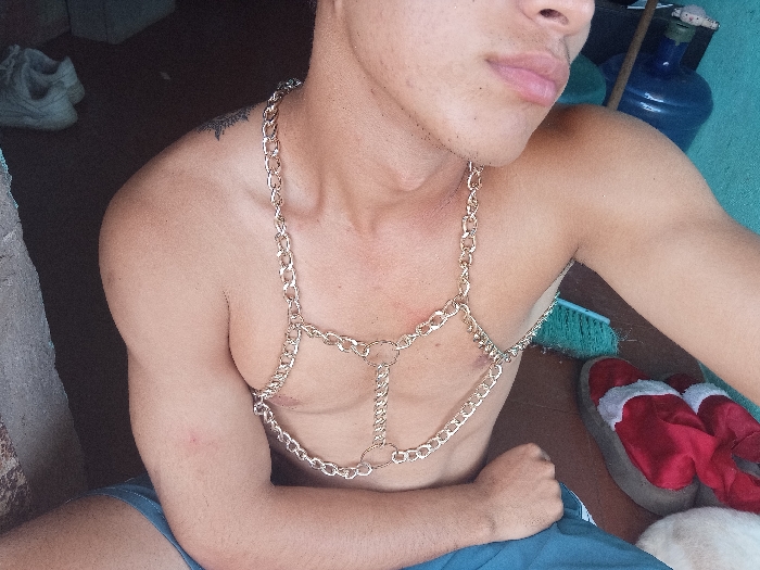 A light-skinned man with a gold chain harness poses, revealing his upper body