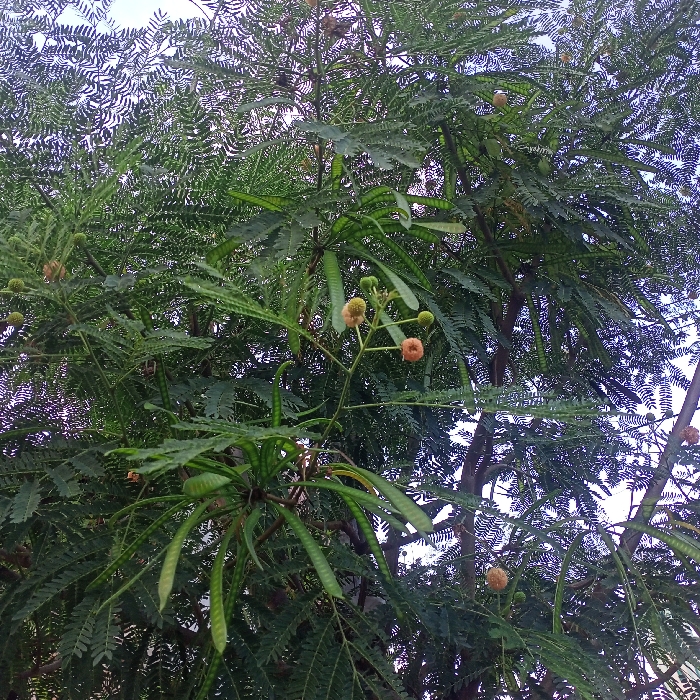 A dense canopy of a tree is depicted, located in the city of Ketowan, Indonesia, viewed from below. The foliage consists of numerous small, dark green, bipinnately compound leaves. Multiple elongated, flat, green seed pods, approximately 10-15 cm long, are prominently displayed among the leaves, some straight and others slightly curved. Spherical clusters of immature flowers or fruits, ranging from pale yellow-green to reddish-brown and measuring about 1-2 cm in diameter, are also scattered throughout the branches. Darker tree branches are partially visible through the dense leaf cover. The background is a bright, largely obscured sky. No human subjects or artificial structures are present within the frame.