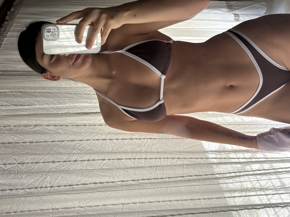 A slender woman poses in a brown and white trim bikini. She holds a cell phone to take a selfie, partially obscuring her face. The background is a textured white surface, possibly a bed or window covering. Light and shadows play across the scene. The woman's body is the central focus, and the angle suggests a casual, personal moment.