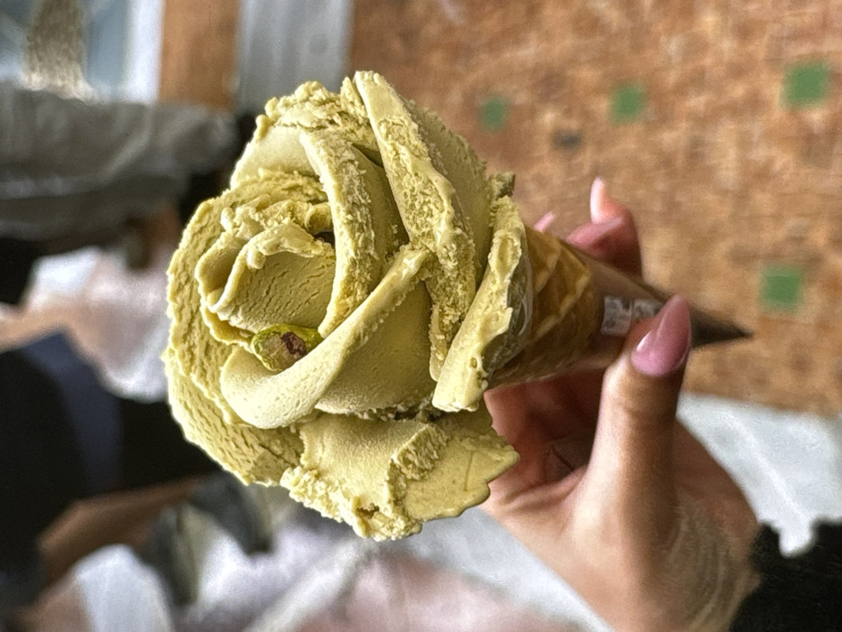 The image displays a close-up view of a human hand holding a pistachio-flavored ice cream cone, artistically sculpted to resemble a blooming rose