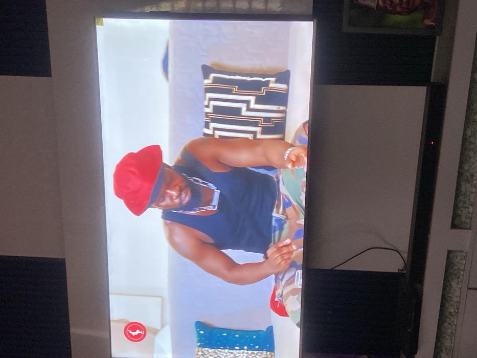 The image displays a widescreen television screen, observed from a slightly low angle, within an unspecified indoor setting. The television features an adult male, likely of African descent, seated and looking downwards at his hands. He wears a red bucket hat, a black sleeveless tank top, and camouflage-patterned trousers. A silver-toned chain with a rectangular pendant hangs around his neck, and a silver-toned watch is on his left wrist. He is positioned on a light-colored sofa or bench, with a blue and gold/white patterned pillow to his left and a black and gold/white geometric patterned pillow to his right. A red circular logo with a white stylized 'F' or lightning bolt is visible in the top-left corner of the TV display. Below the television, a black soundbar with a small red indicator light is situated on a surface that contains light-colored decorative pebbles. Dark structures frame the television, and a framed object depicting a reddish-brown figure is partially visible to the right. The specific location within the city of Alor, Nigeria, is not identifiable from the visual content provided.