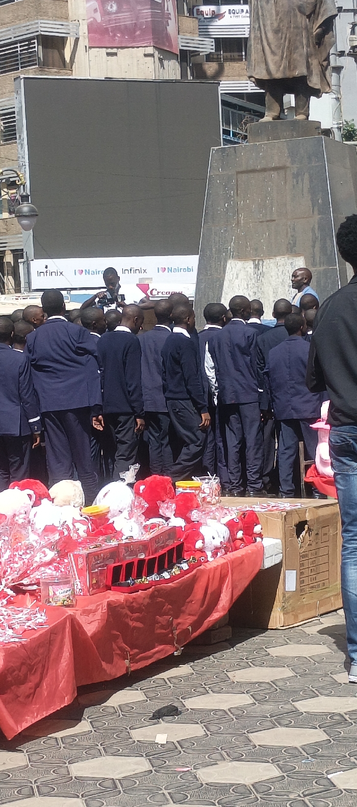 A group of schoolboys wearing navy blue blazers stand in a crowd near a statue. Two adults stand among them. In front of the group is a table covered with a red cloth and filled with trinkets, including stuffed animals and candy jars. A large advertisement is visible behind the group with the words "Infinix I <3 Nairobi." The scene takes place outdoors on a patterned paved surface.