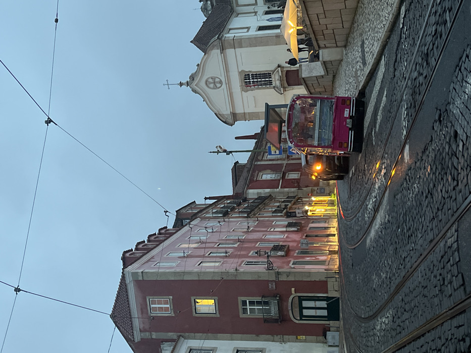An eye-level shot in Portugal shows a street with trolley tracks. A red sightseeing bus idles near a church. Buildings with red and white facades line the street, their windows reflecting the light. Power lines crisscross the overcast sky. The street is paved with cobblestones.