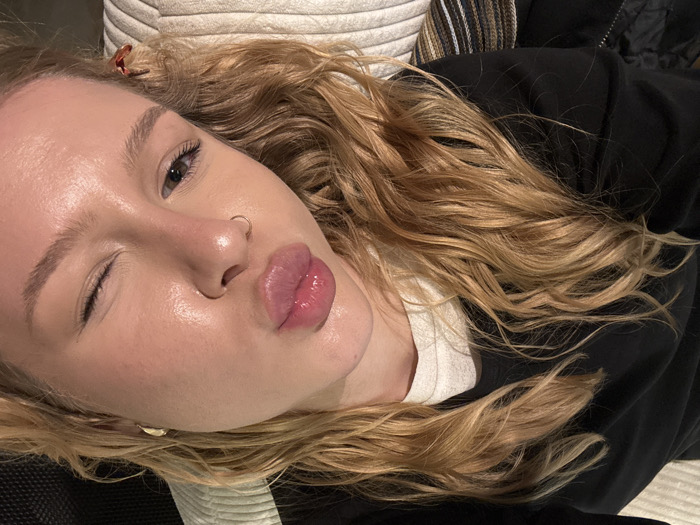 A light-skinned woman poses for a selfie, her head tilted. She winks with one eye, and her lips are pursed in a kiss. A small gold nose ring is visible. Her wavy blonde hair is partially framing her face and spilling onto a black jacket. A beige cushion is slightly visible in the background. A gold hair clip is also noticeable on the top of her hair.