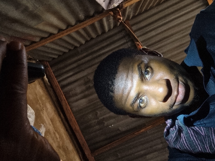 A close-up, low-angle portrait depicts an adult male located within an interior space in Fegge, Nigeria. The subject has a dark complexion, short dark hair, and brown eyes, maintaining direct eye contact with the camera. He exhibits a slight smile and wears a dark collared shirt, with a striped purple and dark-colored fabric draped over his left shoulder. A small piercing is visible in his left ear. At the top of the frame, a dark-skinned hand is partially visible, positioned consistent with holding a camera or mobile device. The background reveals a dimly lit ceiling structure comprising corrugated metal sheets supported by wooden beams, indicating basic architectural construction. The subject's face is illuminated by a direct light source, creating contrast with the darker background.