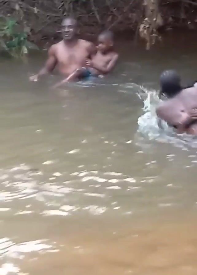 A video shows three individuals, including a man and a child, swimming in a shallow, muddy river