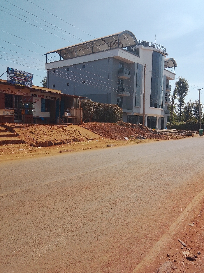 A four-story building with glass and white siding contrasts with a smaller, weathered structure. The taller building features a rooftop structure and balconies. A dirt embankment separates both from a road. Power lines stretch across the sky. Vegetation dots the backdrop. The overall scene depicts an urban intersection, showing a contrast of old and new structures.