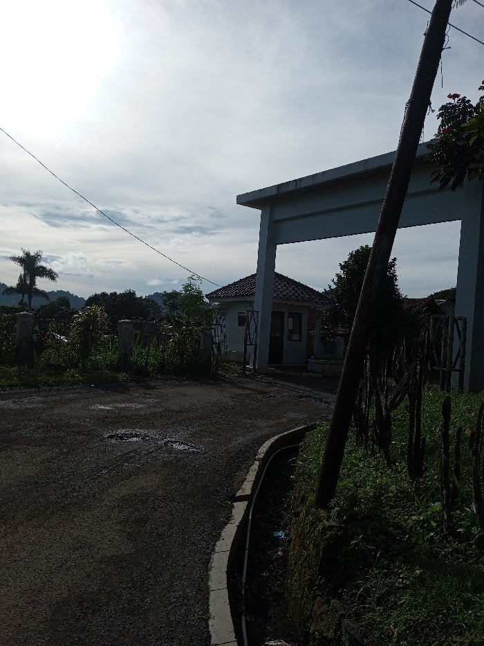 The image depicts an outdoor scene in Ciherang, Indonesia, primarily featuring the entrance to a property under a cloudy sky with diffuse sunlight