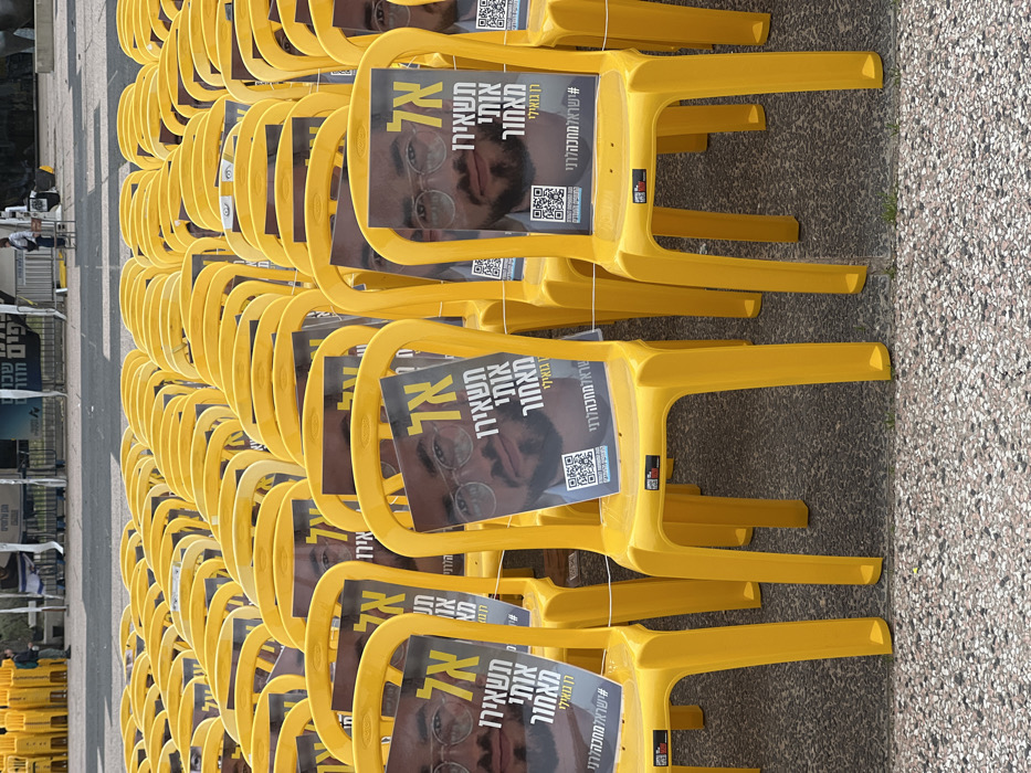 Rows of yellow plastic chairs are lined up on a gray, textured surface. Each chair features a poster depicting a person wearing glasses. The poster text, written in Hebrew, says "Do not leave me behind," along with the name "Ran Gvili." A hashtag, #IsraelWaitingForRan, and a QR code are also on the posters. The chairs seem to be arranged for an event or demonstration.