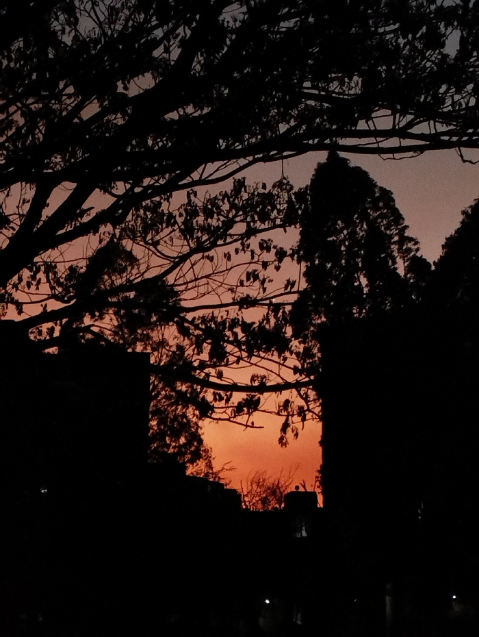 The image displays an outdoor scene during twilight in Guacara, Venezuela. The sky transitions from a light peach-orange at the lower horizon, deepening to a reddish-orange mid-frame, and fading into a muted purplish-blue at the upper edge. The foreground and midground are occupied by heavily silhouetted elements, primarily dense tree canopies and discernible branches, with some visible foliage. Several indistinct, blocky architectural structures are also silhouetted against the lower half of the sky, consistent with an urban or suburban environment. Two small, isolated points of light are visible near the base of some of these structures in the lower frame. No individuals, specific objects beyond general structures and vegetation, or actions are discernible.