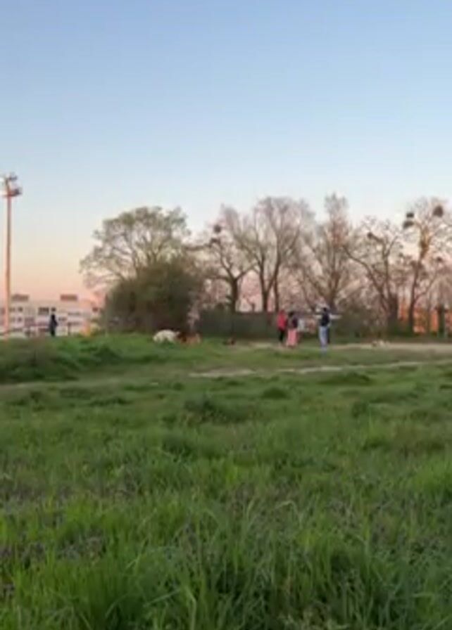 In a wide shot, a grassy field takes up the foreground. Further back, a group of about six people stand near a row of trees. Several dogs are near the group. In the distance, there are buildings and a light pole. The sky is blue with a hint of pink at the horizon, suggesting it is either dawn or dusk. A person walks in the background on the left.