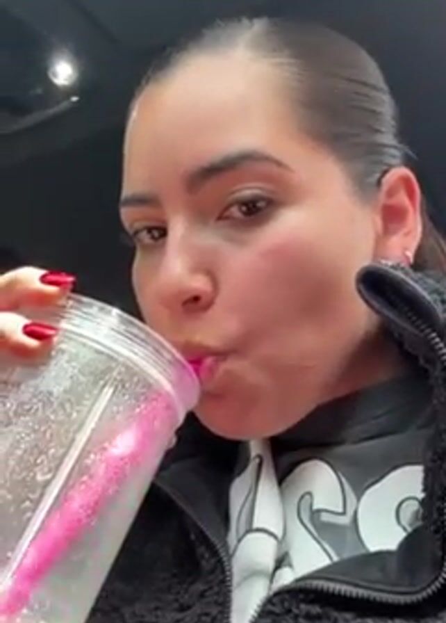 A woman with her dark hair pulled back is drinking a smoothie out of a clear plastic container with a pink straw. The smoothie appears yellow and opaque. She wears a black fleece jacket over a black t-shirt with white graphics. Her fingernails are painted red. The background is black. She takes several sips, looking directly at the camera.