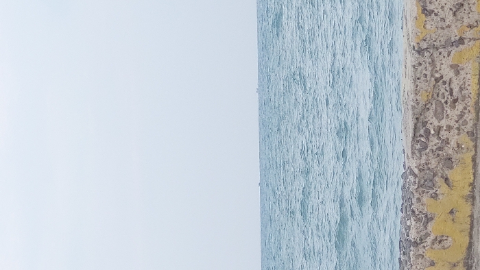 The image depicts a coastal scene in Lhokseumawe, Indonesia, under an overcast sky. In the foreground, a concrete barrier or wall with exposed aggregate, partially discolored with faded yellow markings, runs horizontally across the lower portion of the frame. Beyond this barrier, the midground is dominated by the blue-green waters of the ocean, showing surface ripples and small waves. On the distant horizon, where the sea meets a pale, featureless sky, two small, dark silhouettes of what appear to be watercraft are visible, one to the left and one to the right of the central axis. No individuals or specific actions are discernible within the frame.