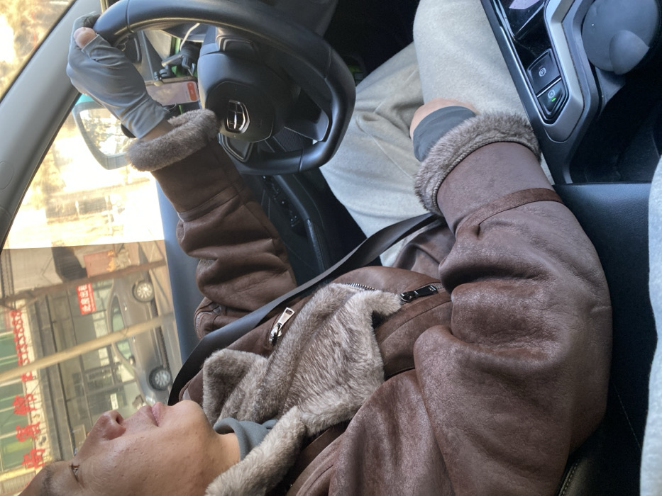An individual in a car, wearing a brown leather jacket with fur trim, is seen holding the steering wheel