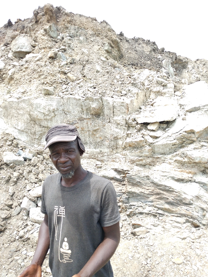 An adult male stands outdoors in Otulu, Nigeria, positioned slightly left of center, facing the camera directly. He is of African descent, with a short beard and dark skin, wearing a dark grey short-sleeved t-shirt featuring a white graphic print of stylized Chinese characters and a meditating figure. A worn, light brown or grey cap with ear flaps covers his head. His hands are partially visible at the bottom of the frame. The background consists of a large, exposed rock face, showing visible strata and fractures, and a substantial mound of loose rocks, soil, and debris. The sky in the upper portion of the image is overexposed and white, indicating bright daylight.
