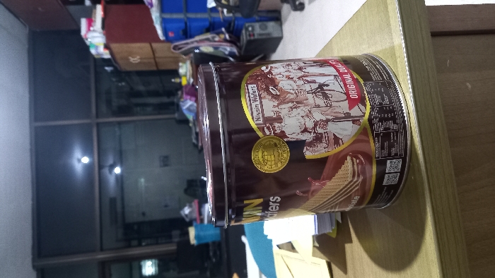 - "A dark brown cylindrical tin labeled "Nissin Wafers" is positioned prominently in the foreground, slightly right of center" by FM-FrMp53, licensed under CC BY 4.0