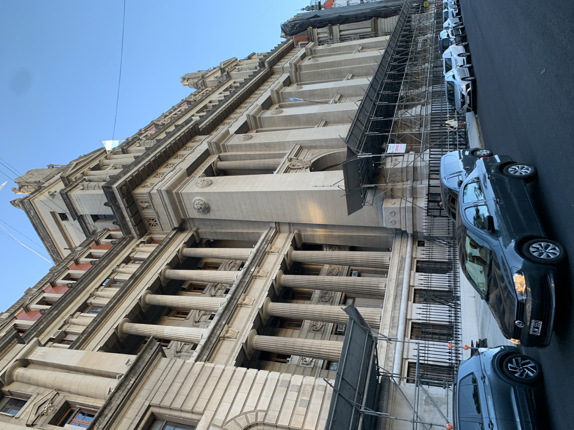 The image captures a street-level view of the Palacio de Justicia, located on Talcahuano street in the San Nicolás neighborhood of Buenos Aires, Argentina. The imposing multi-story building, constructed of light-colored stone, features neoclassical architecture with numerous large fluted columns, ornate decorative carvings including lion heads, and an Argentinian flag visible on an upper level. Extensive metal scaffolding covers the lower and mid-sections of the building's facade. On the street in the foreground, a dark green Volkswagen Gol sedan, bearing license plate OJW 551, is positioned, with its headlights illuminated. To its left, a dark gray Volkswagen T-Cross SUV is partially visible. A row of parked vehicles, consisting of a dark gray panel van and several light-colored sedans, lines the street along the curb on the right side of the frame. A black metal fence separates the sidewalk from the building. One female pedestrian, dressed in light-colored clothing, walks on the sidewalk behind the parked cars. The scene is illuminated by natural light under a clear blue sky, with overhead utility wires visible.