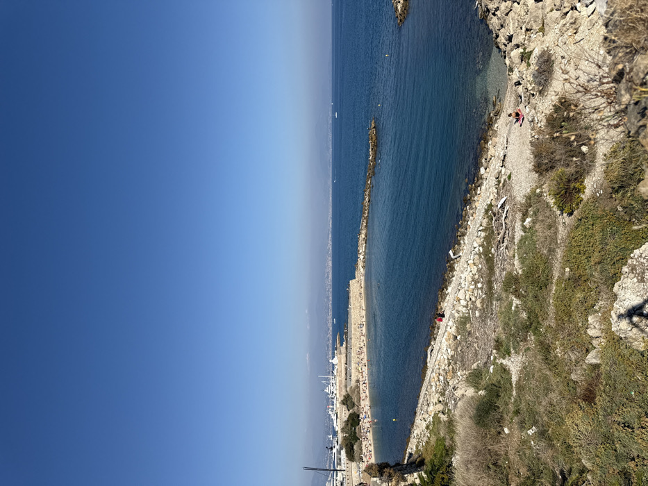 This image depicts a panoramic view of the coastline in Antibes, France, under a clear, bright blue sky. The scene is observed from an elevated, rocky vantage point covered with sparse Mediterranean vegetation. The top half of the frame is dominated by a cloudless blue sky, meeting a distant, hazy horizon where the sea merges with land, revealing faint outlines of mountains and urban development. The Mediterranean Sea occupies the midground and right side, presenting as calm and deep blue. Several small vessels are visible on the distant water. In the midground, a sheltered bay is prominent, featuring a sandy beach crowded with numerous individuals. These people appear to be relaxing, sunbathing, or engaged in water activities. The beach is bordered by a robust, light-colored stone wall or promenade. Extending into the bay, a substantial stone breakwater curves from left to right, partially enclosing the inner waters. Further left, beyond the beach, a marina is visible, filled with numerous large white luxury yachts and sailboats. The foreground consists of a rocky, uneven terrain interspersed with patches of dry and green scrub vegetation. In the lower left, the distinct shadow of a person, presumably the photographer, is cast upon the rocks. Two individuals are seated on the rocky shore in the lower-mid left, one wearing red and the other dark clothing. Another individual, dressed in pink, is seated near a smaller rocky inlet on the lower-mid right. Yellow buoys are visible in the water within the sheltered bay.