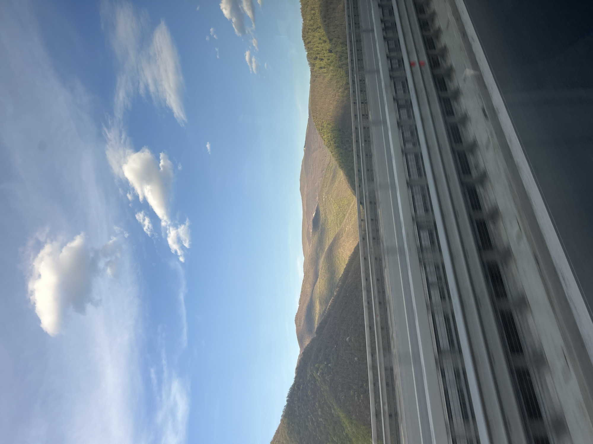 A view from a train window captures a scenic landscape