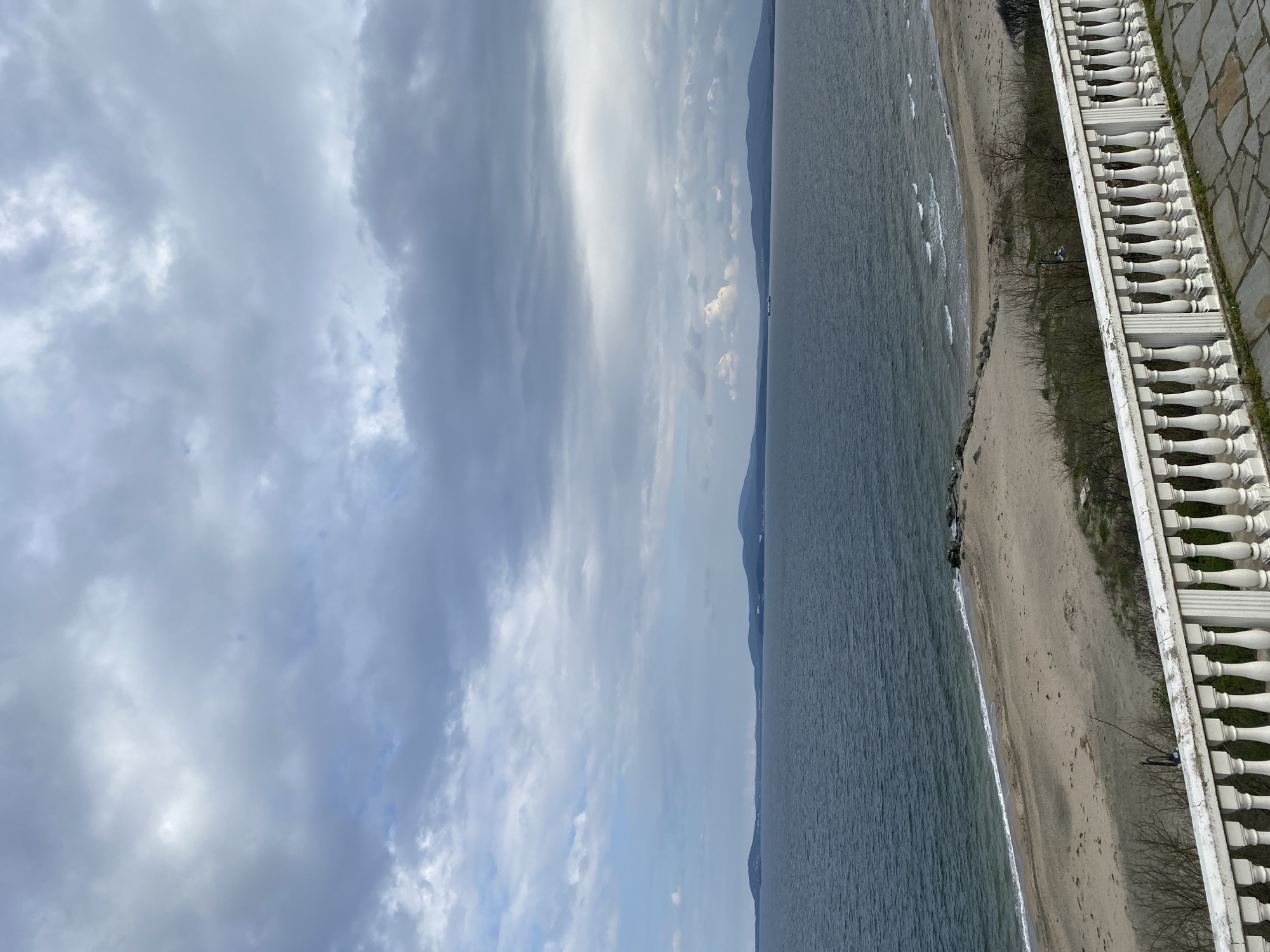 view from an elevated position in Burgas, Bulgaria, overlooking the Black Sea. The scene features a gray-sand beach with gentle waves lapping the shore. The sky is overcast with varying shades of gray clouds. On the right side of the image, there is a stone wall with a white balustrade, adding a formal architectural element to the scene. Some bare trees are visible between the balustrade and the beach. In the distance across the water, land with low mountain profiles can be seen on the horizon.