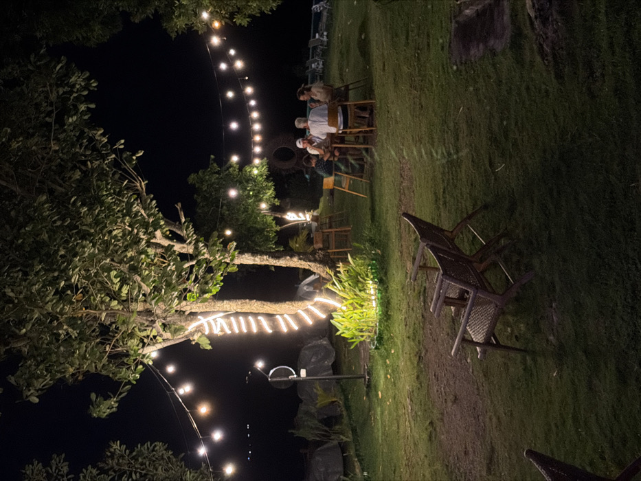 The image depicts an outdoor nighttime scene at a venue in Sakti, Indonesia. The environment consists of a grassy lawn with several trees, some of which are illuminated with decorative string lights featuring globe-style bulbs. One prominent tree trunk is wrapped with white LED strip lights, and its base is accented by a green-lit shrubbery patch. In the mid-ground, a group of four individuals is seated around a square wooden table: a male in a dark shirt, a male in a white baseball cap and white t-shirt, an older male with white hair, and a female with light hair. They appear to be engaged in conversation or dining. In the foreground, two empty wicker chairs with wooden frames are positioned on the grass, facing away from the viewer. A dark pole with a small white sign is visible to the left. In the background, beyond the seated group, other empty chairs, possibly lounge chairs, and additional tables are discernible near what appears to be a darker perimeter. A large, dark, circular object is partially visible in the mid-background. The distant background shows a dark expanse with several faint lights, suggesting a body of water or distant land features.