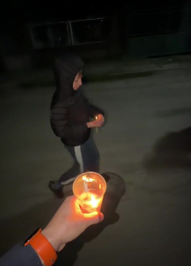 two people holding candles outside at night. The person holding the camera has an orange smartwatch on their wrist and is holding a lit candle in a clear plastic cup. A child in a black hooded jacket is walking away, holding a lit candle in their hands. The area is dark, with the candles providing the only light. There's a building with windows visible in the background. The child turns to look at the camera.