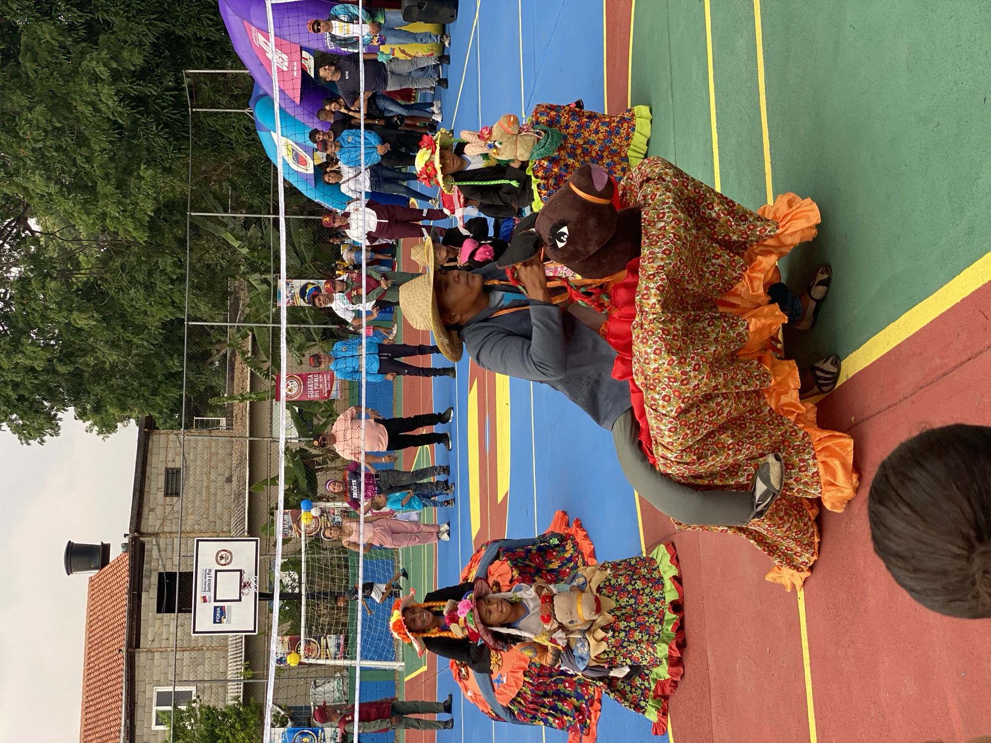 celebration taking place on a multi-colored (red, blue, green) painted sports court. People, some wearing traditional, colorful costumes and straw hats, are at the event. In the background, a basketball hoop stands near a gray concrete building. A volleyball net stretches across the court. A group of onlookers stands behind the net. The presence of a building and court suggests this is located in an urban or suburban setting, likely Tinaquillo, Venezuela.