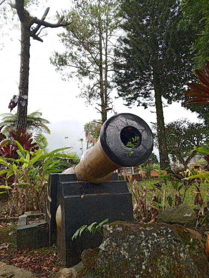 This image depicts a static historical monument within an outdoor, vegetated setting in the city of Weinten, Liberia. The primary subject is a weathered, light brown cannon barrel with a dark grey/black muzzle and trunnions, mounted on a dark grey/black, block-like carriage. Small green plant growth is visible inside the cannon's muzzle. The cannon is positioned on a slight incline, angled upwards and to the right. In the immediate foreground, to the bottom right, large, moss-covered rocks are present. The ground around the cannon and carriage is covered with scattered dry leaves and various green and reddish-leafed plants, some partially obscuring the base of the monument. To the left of the cannon, a thick-trunked tree with gnarled branches and attached white, heart-shaped decorations stands prominently. Other dense green foliage, including large fern-like plants and broad-leafed plants, surrounds the cannon. The background features multiple tall trees, including those with needle-like leaves characteristic of conifers and others with more sparse branching. The sky is overcast and bright, suggesting diffused lighting. In the far distance, beyond the foliage and haze, faint outlines of utility poles or streetlights and other distant structures are discernible, hinting at a developed area beyond the immediate greenspace. No people are visible, and no actions or interactions are occurring; the scene is entirely static.
