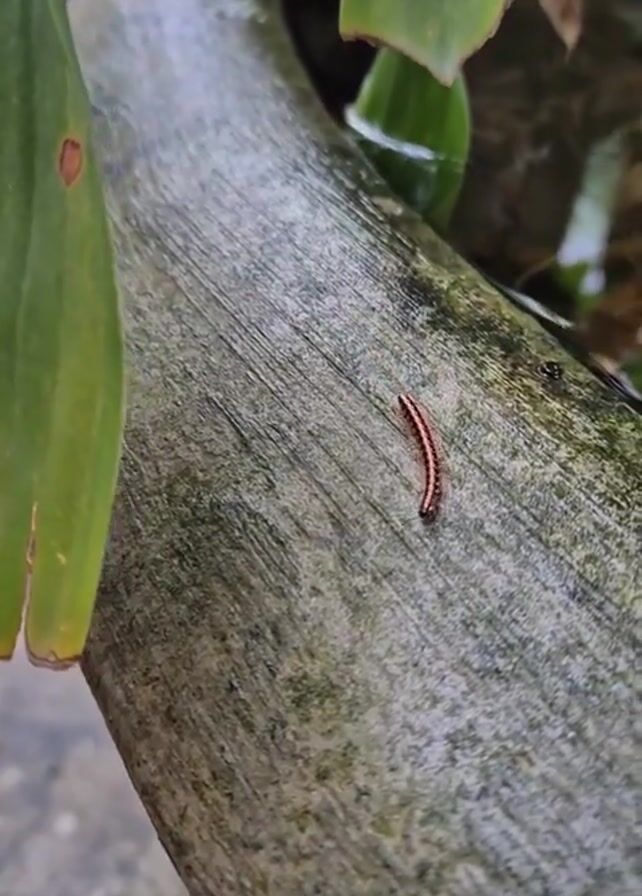 close-up of a reddish-brown millipede with black stripes crawling on the curved rim of a planter