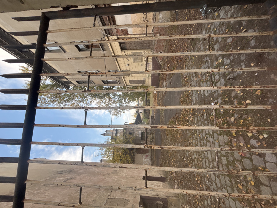 The image displays a forensic, matter-of-fact view into a neglected urban courtyard in Łódź, Poland, observed through a heavily rusted, white-painted metal gate
