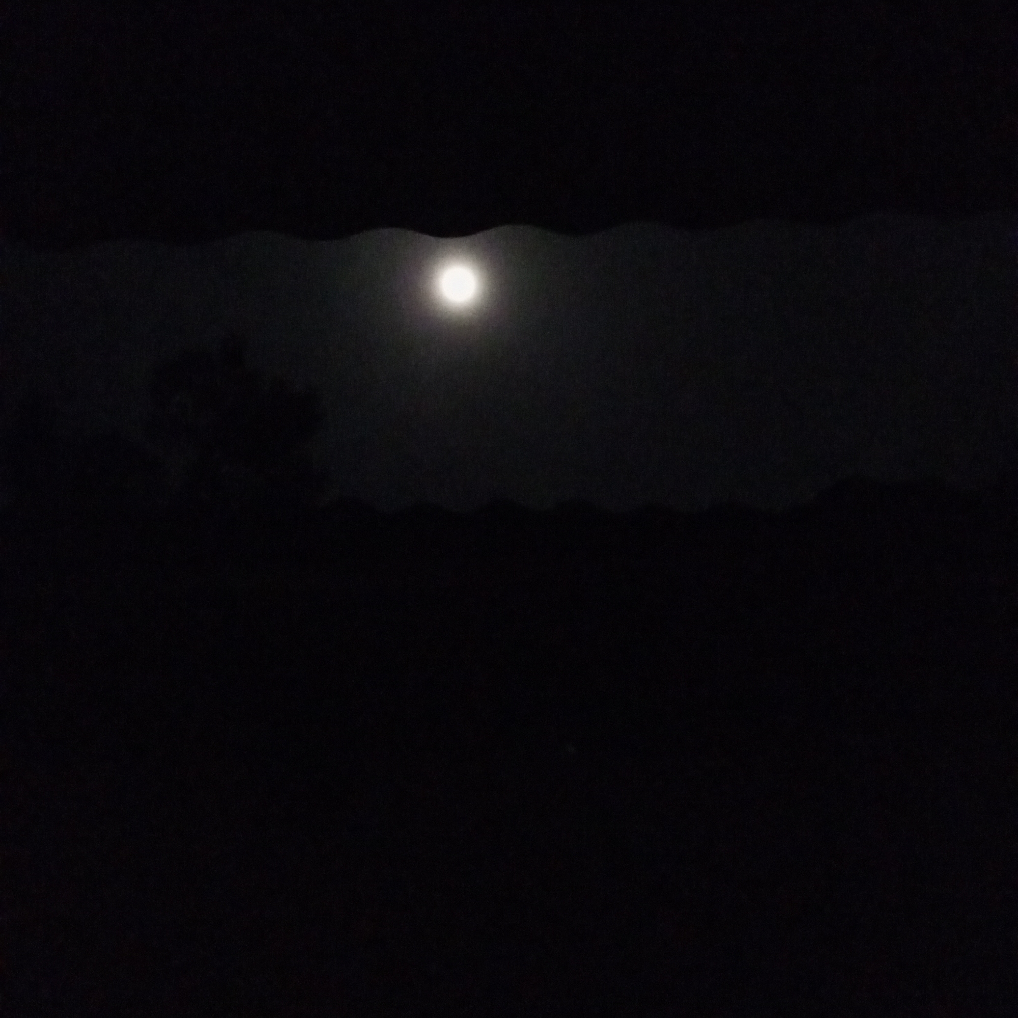 The image depicts a night scene, potentially in Borabu Chitago ward, Kenya, though location cannot be conclusively verified. A full moon is visible in the sky, partially obscured by what appears to be a corrugated roof edge in the upper portion of the frame. Below the moon, a dark silhouetted landscape is visible, suggesting trees or hills. The foreground is predominantly dark, likely depicting shadows or unlit areas. No people or specific objects are readily identifiable due to the low light conditions. There are no actions or interactions observed. The environment is generally dark, with the moon as the primary light source.