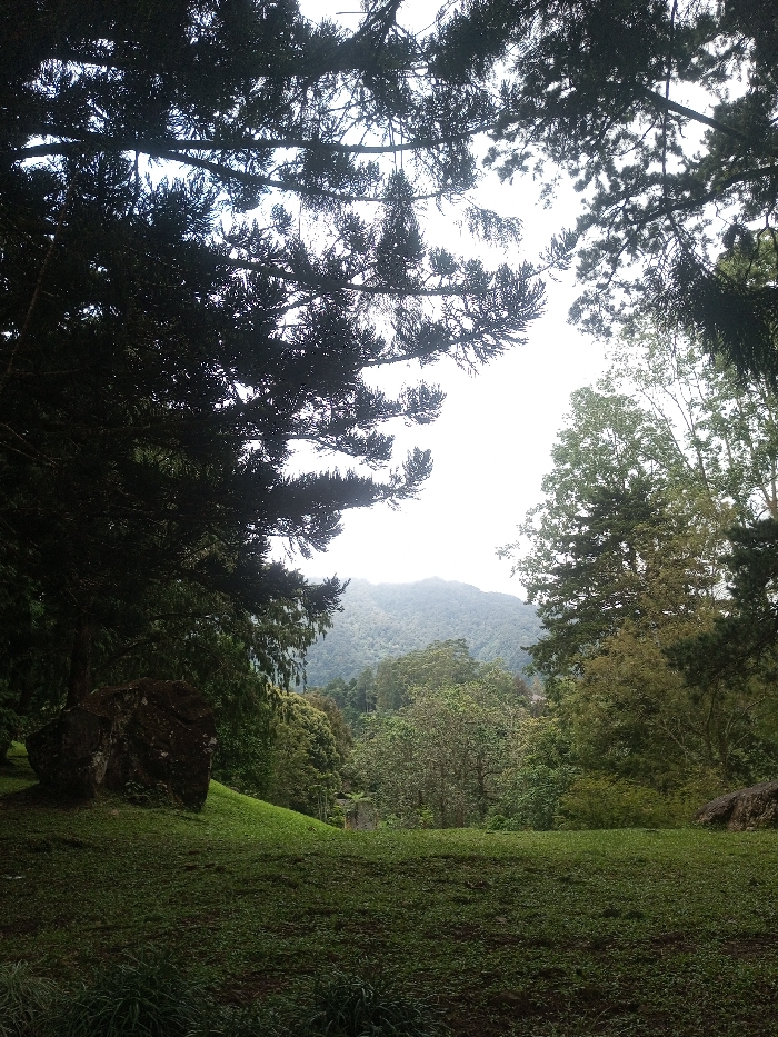 The image displays a natural landscape situated in the city of Padegaon, India. The foreground consists of a green grassy slope with a prominent dark rock positioned on the left and a smaller, partially obscured dark rock on the right. The upper and left areas of the frame are characterized by dark evergreen tree branches and needles silhouetted against a uniformly bright, overcast sky. The midground features a dense expanse of diverse green trees, forming a forested area. In the background, a hazy mountain range is visible, consistent with atmospheric perspective. No people, discernible structures, specific actions, or interactions are present within the scene.