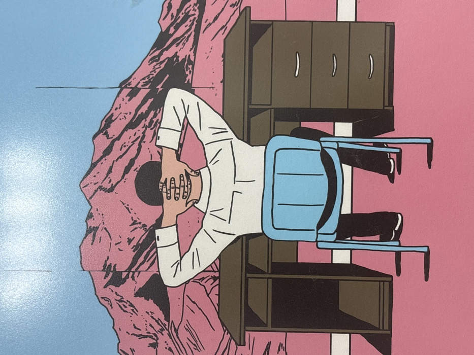 An illustrative scene features a person seated at a desk, head in hands. The desk, with cabinets and open shelves, is brown, while the chair is blue. A landscape element is juxtaposed, with a mountain range in pink and brown against a blue sky, occupying the left side of the frame. The background is a solid pink. The perspective is slightly off-kilter, creating a surreal effect. The artwork style is bold and graphic.