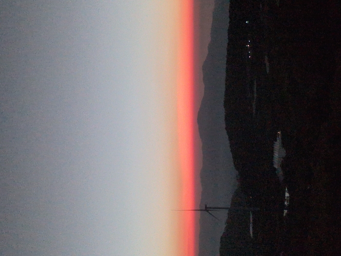 The image captures an elevated, wide view of a mountainous landscape at twilight in the city of Trường Thọ, Vietnam. The sky transitions from a pale blue-grey at the top, through a prominent horizontal band of vibrant orange-red across the mid-horizon, to a darker reddish hue nearer the terrain. The foreground and midground consist of dark, undulating hills heavily silhouetted, covered with indistinct vegetation. A slender, dark wind turbine mast stands vertically on the left side, extending from a midground hill towards the sky. Several small, bright points of artificial light are visible scattered across the dark hills, indicating distant structures or habitation. Below the wind turbine and slightly to the right, a few irregular, lighter-colored patches suggest reflective surfaces, possibly water bodies or illuminated structures. In the background, multiple layers of hazy, darker mountains extend into the distance, silhouetted against the colorful sky. No human figures or specific actions are discernible.