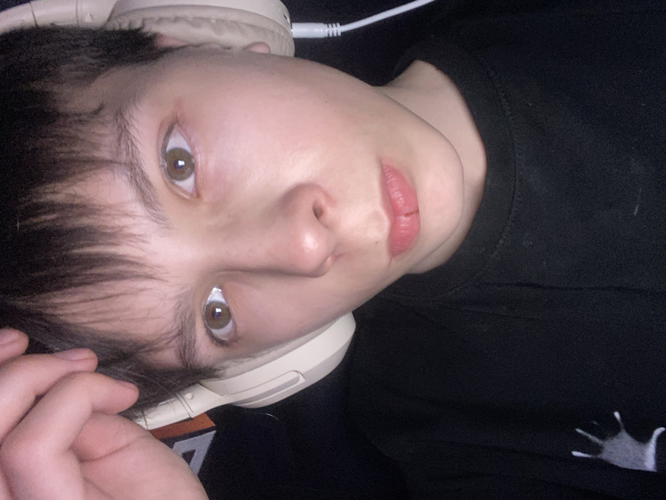 A close-up, front-facing image depicts a young individual in Andreyevo, Russia, observed from the chest up. The individual has short, dark brown hair and brown eyes. A distinct vertical laceration or split is visible on the lower lip, slightly to the viewer's left of the philtrum. Light-colored, possibly cream or beige, over-ear headphones are worn, with a white audio cable extending downwards from the right ear cup. The individual's right hand is raised, with fingers partially visible in the upper left corner, resting near the forehead. A black crew-neck t-shirt is worn, featuring a partial white graphic, resembling a stylized hand or paw print, on the lower left portion visible in the frame. The background is uniformly dark and indistinct.