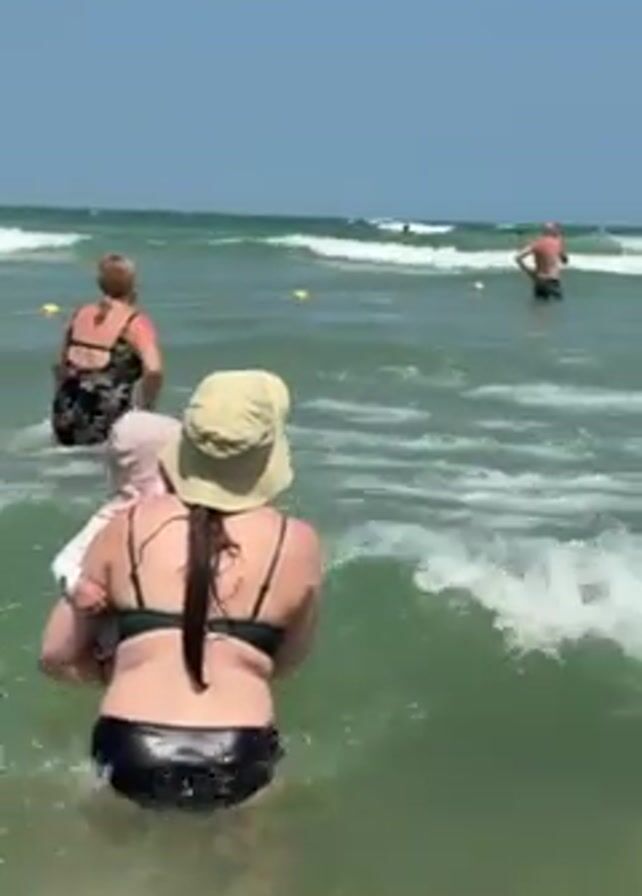 The video depicts a beach scene on a sunny day. A woman in a black bikini and a tan hat is carrying a toddler who is wearing a pink hat and a light-colored outfit, wading into the ocean. Other individuals are visible further out in the water, with waves breaking in the background. The water appears green and slightly choppy. The sky is a clear blue.